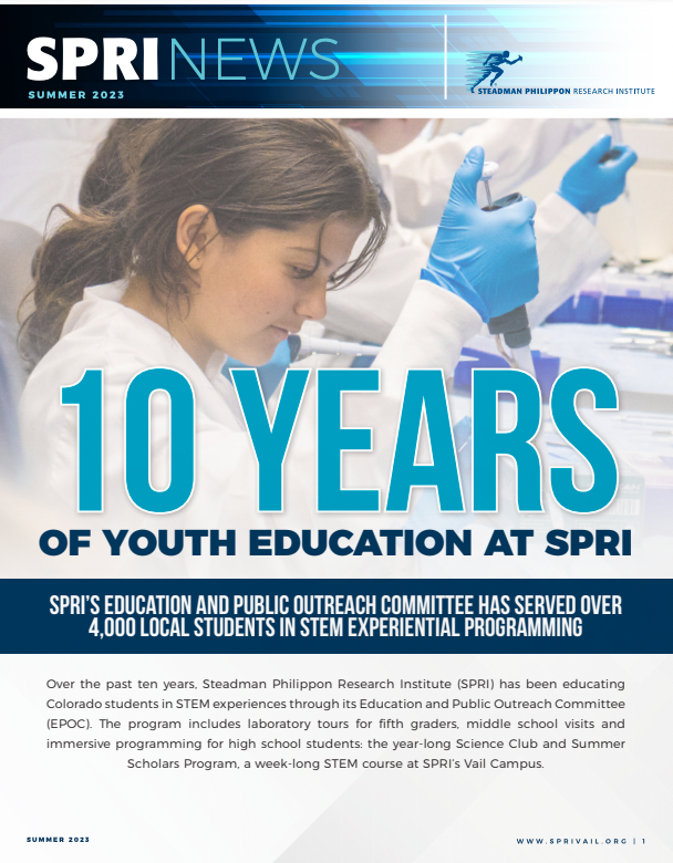 Over the past ten years, Steadman Philippon Research Institute (SPRI) has been educating Colorado students in STEM experiences through its Education and Public Outreach Committee (EPOC). The program includes laboratory tours for fifth graders, middle school visits and immersive programming for high school students: the year-long Science Club and Summer Scholars Program, a week-long STEM course at SPRI’s Vail Campus.